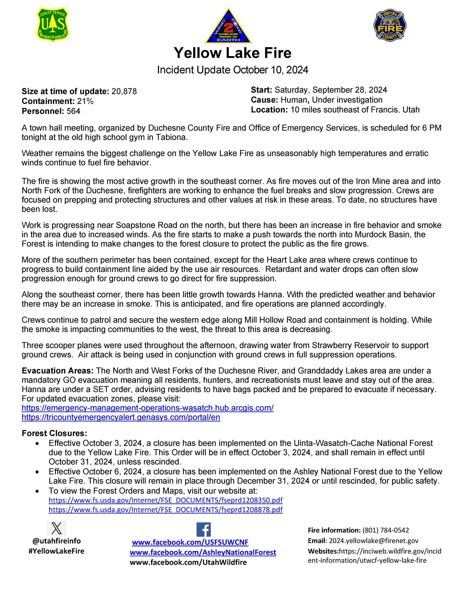 10 de octubre de 2024 @ 4PM: Actualización sobre el #IncendioYellowLake — Una reunión comunitaria, organizada por el Departamento de Bomberos del Condado de Duchesne y la Oficina de Servicios de Emergencia, está programada para las 6 PM de esta noche en el antiguo gimnasio de la escuela secundaria en Tabiona.